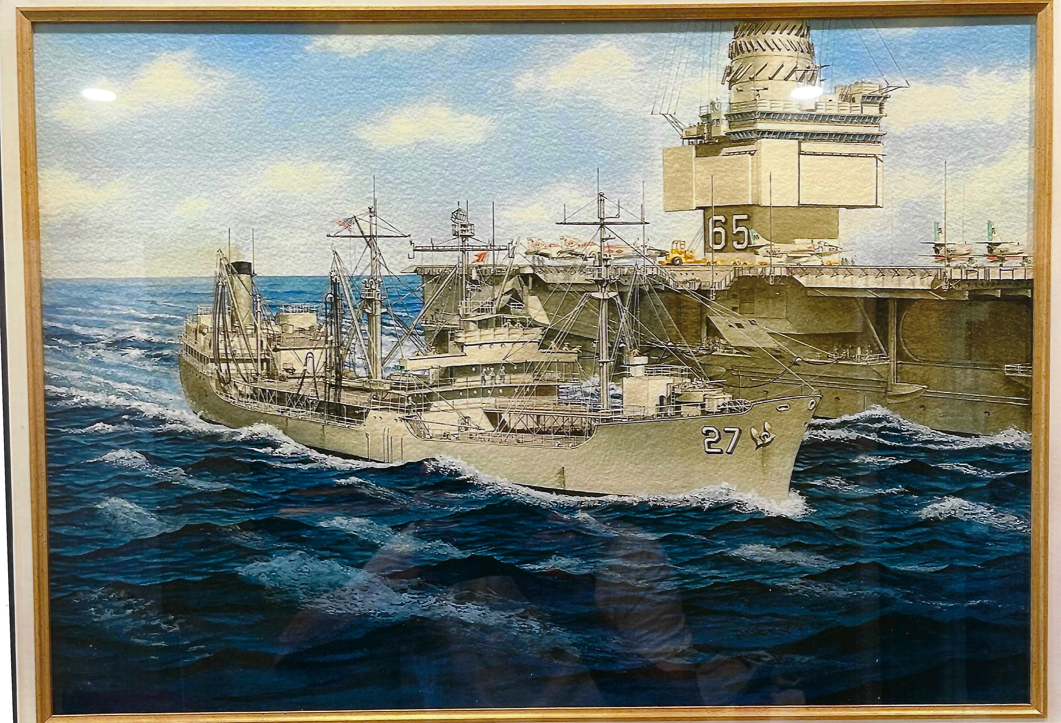 Ron also had a photograph of the Kaskaskia when in was in the yard in Hoboken being prepared for recommissioning. Ron gave that photo to an artist to create a color canvas of the Kaskaskia at sea. In the photo the forward gun was pointed aft. The artist dutifully reproduce the Kaskaskia at sea with the gun pointing at the bridge. He also included the sister ship USS Sabine (AO-25) in the background.