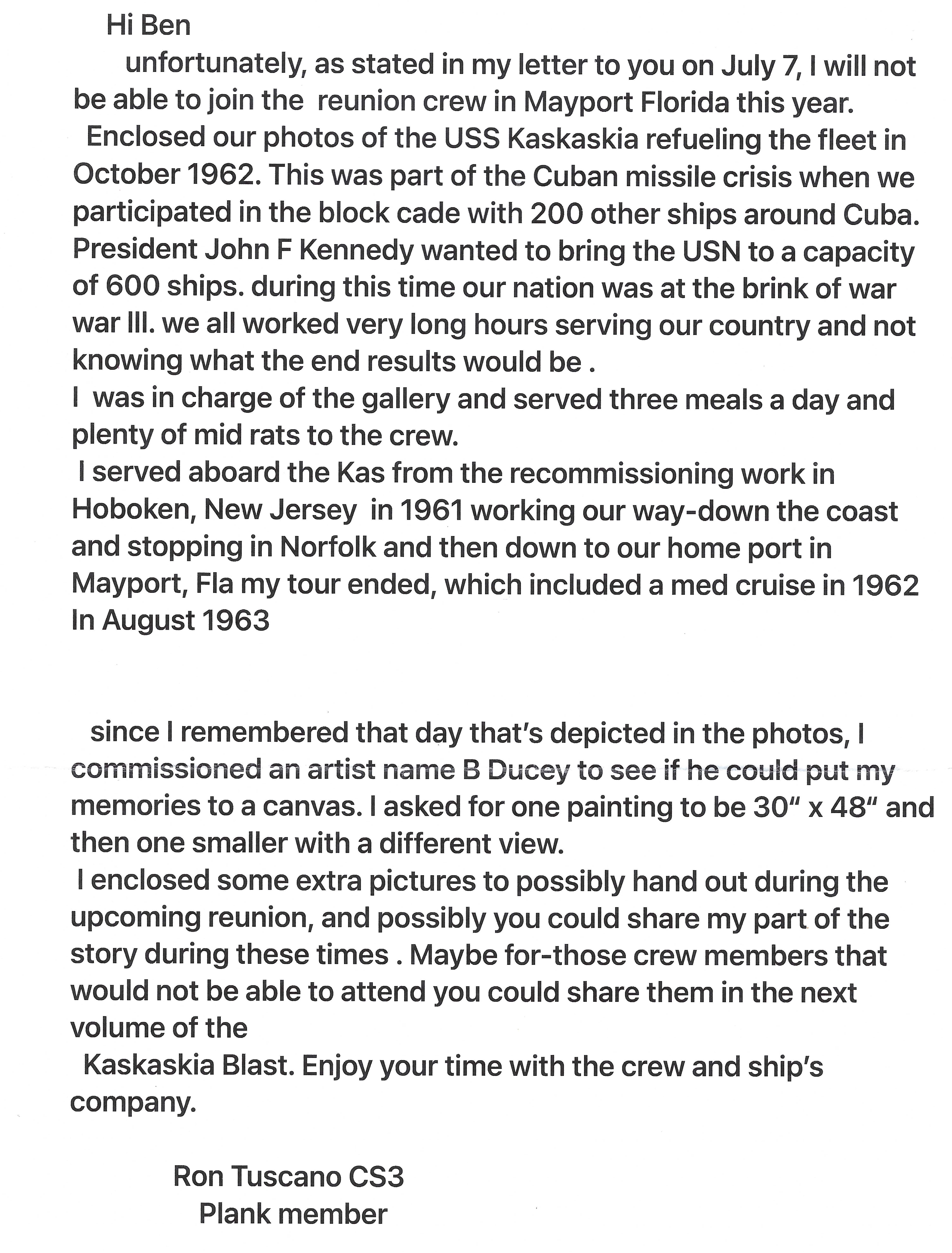 Kaskaskia Plank Owner Ron Tuscano CS3 (1961-1963) had two B&W photos from the time the ship was part of the Cuban blockade. Ron had an artist recreate those photos in color on canvas. He made photographs of those and shared those with us at the 2025 Jacksonville Reunion. This is a copy of the letter Ron sent to Ben with these photos.