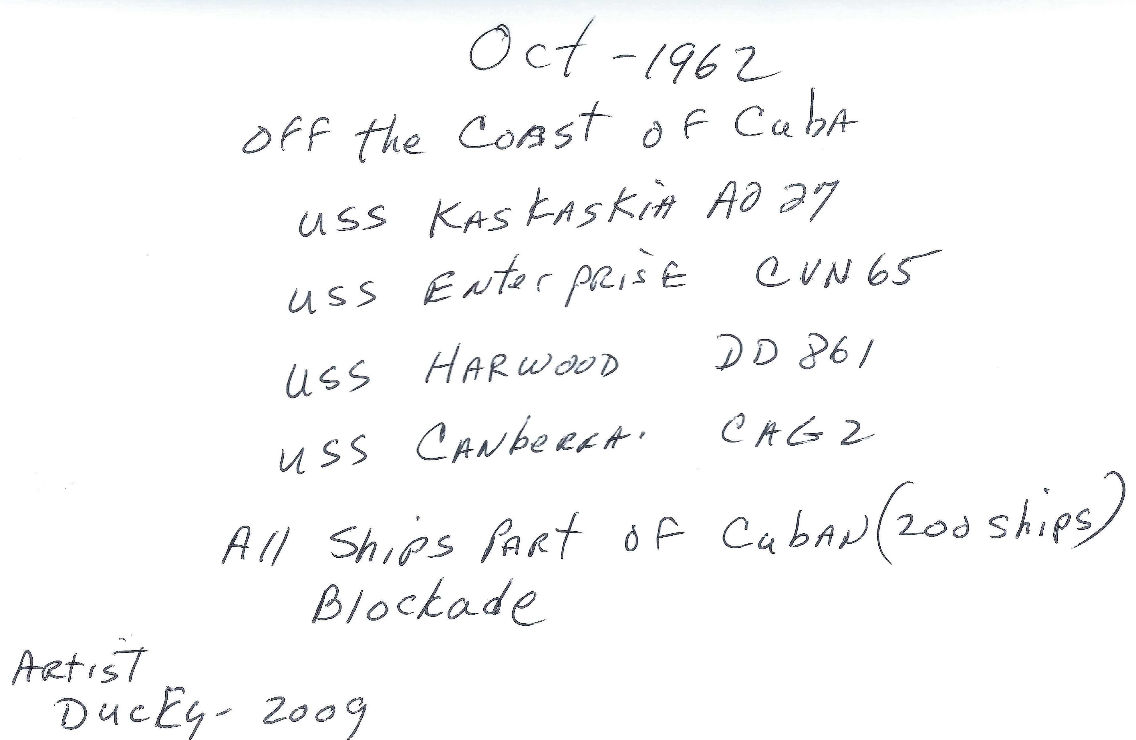 Kaskaskia Plank Owner Ron Tuscano CS3 (1961-1963) had two B&W photos from the time the ship was part of the Cuban blockade. Ron had an artist recreate those photos in color on canvas. He made photographs of those and shared those with us at the 2025 Jacksonville Reunion. This is a copy of the letter Ron sent to Ben with these photos.