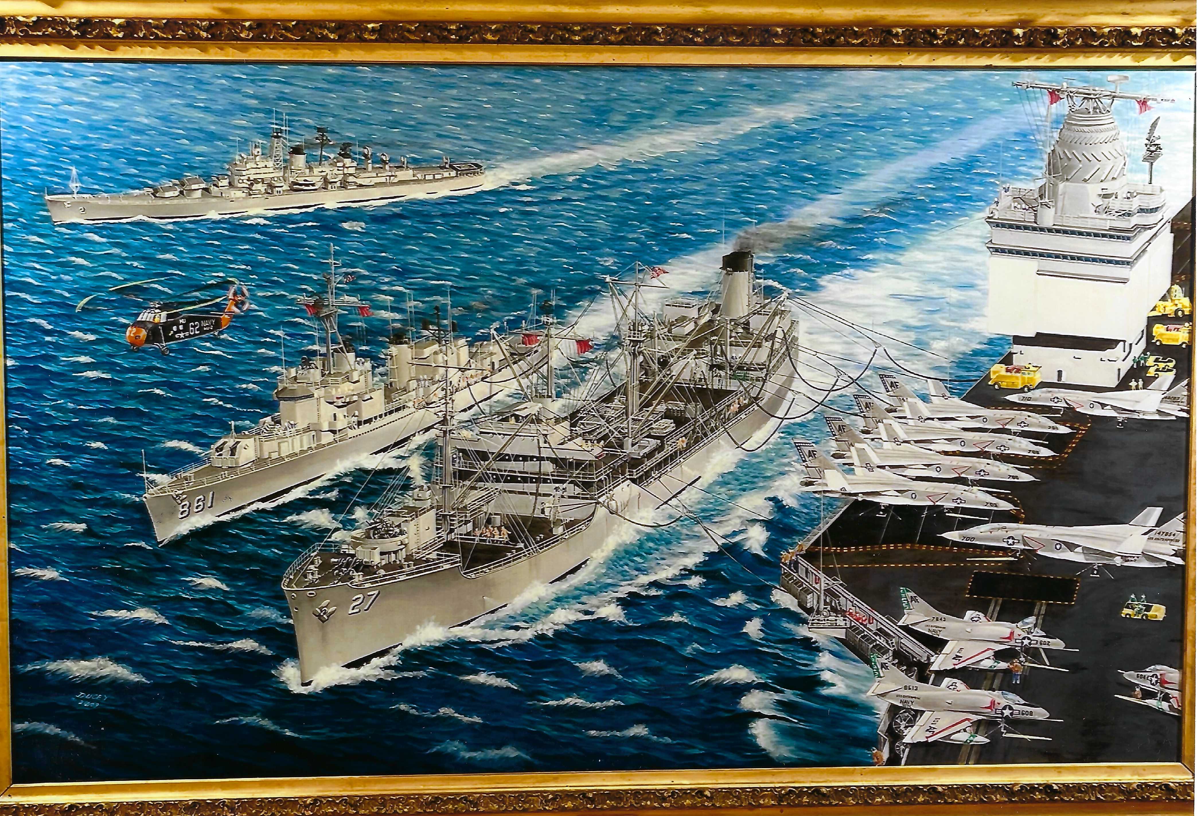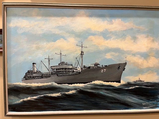 Ron also had a photograph of the Kaskaskia when in was in the yard in Hoboken being prepared for recommissioning. Ron gave that photo to an artist to create a color canvas of the Kaskaskia at sea. In the photo the forward gun was pointed aft. The artist dutifully reproduce the Kaskaskia at sea with the gun pointing at the bridge. He also included the sister ship USS Sabine (AO-25) in the background.